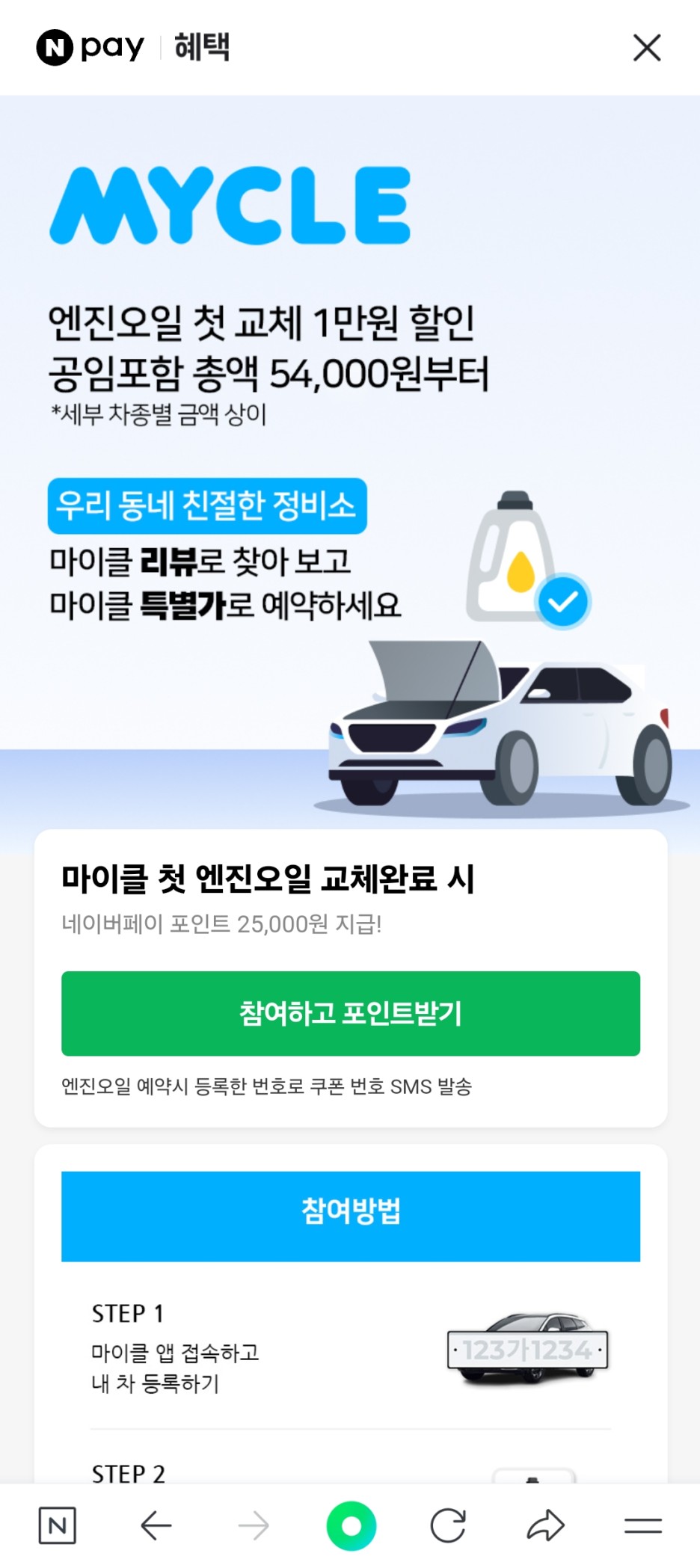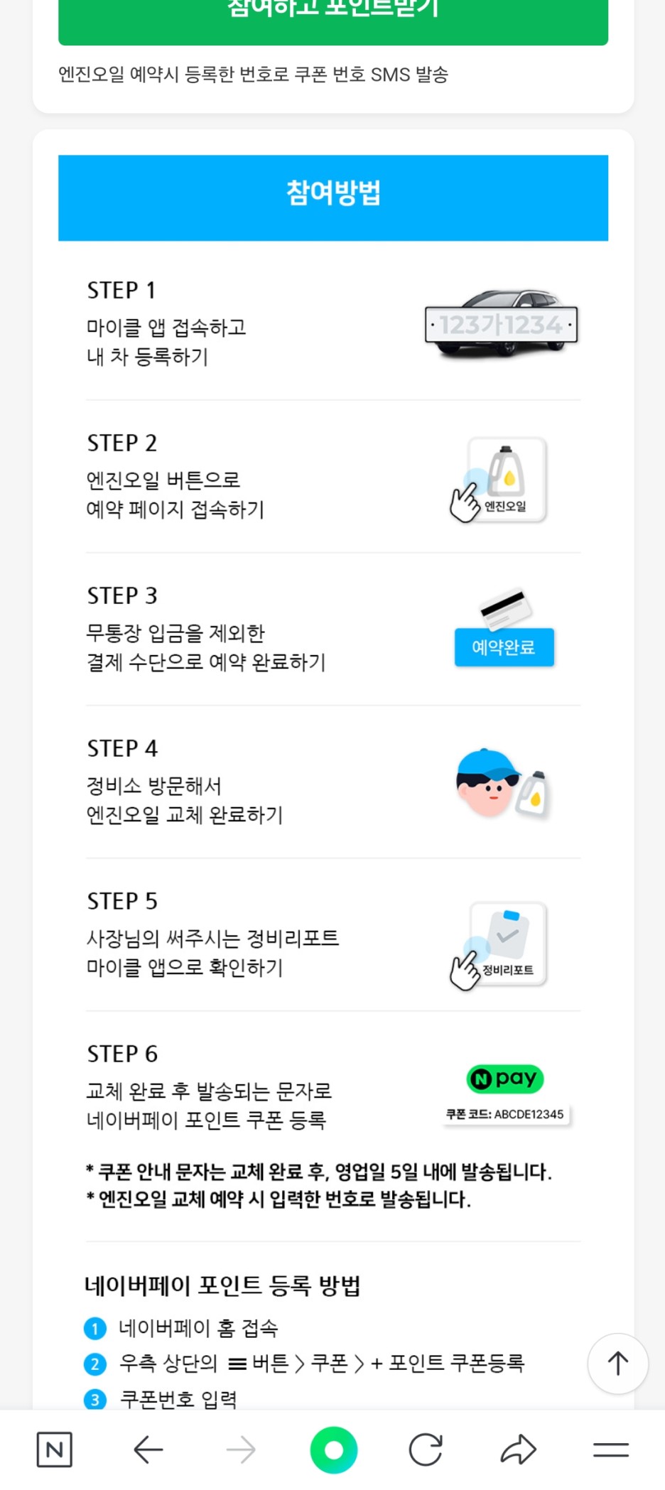 참여하고 포인트받기를 누르고 어플을 다운받아 설치했습니다. 다행히 이번에는 제 차량번호가 검색이 되었고, 제 차량에 맞는 엔진오일까지 특정해 주었습니다. 전국 정비소 평균가에서 약30% 할인된 가격에서 첫 교환 10,000원 할인 또는 신규입점 정비소 20,000원 할인 쿠폰을 추가로 적용할 수 있었습니다. 그래서 바로 쿠폰을 지급하는 근처 정비소중에서 맘에드는 곳으로 예약을 했습니다. 저는 전국 정비소 평균 83,600원에서 약30% 할인된 69,000원에서 20,000원 쿠폰을 적용해 49,000원에 결제 후 엔진오일을 교체했습니다. 물론 예약제라 기다리는 시간도 적었고, 타이어 공기압이나 워셔액 보충 및 엔진룸 청소까지 깔끔하게 마무리 해주셔서 만족스러웠습니다. 엔진오일 교체후 5영업일 내에 네이버페이 포인트 25,000원도 받으면 24,000원에 엔진오일을 교체한 것이되어 더욱 만족스럽습니다.